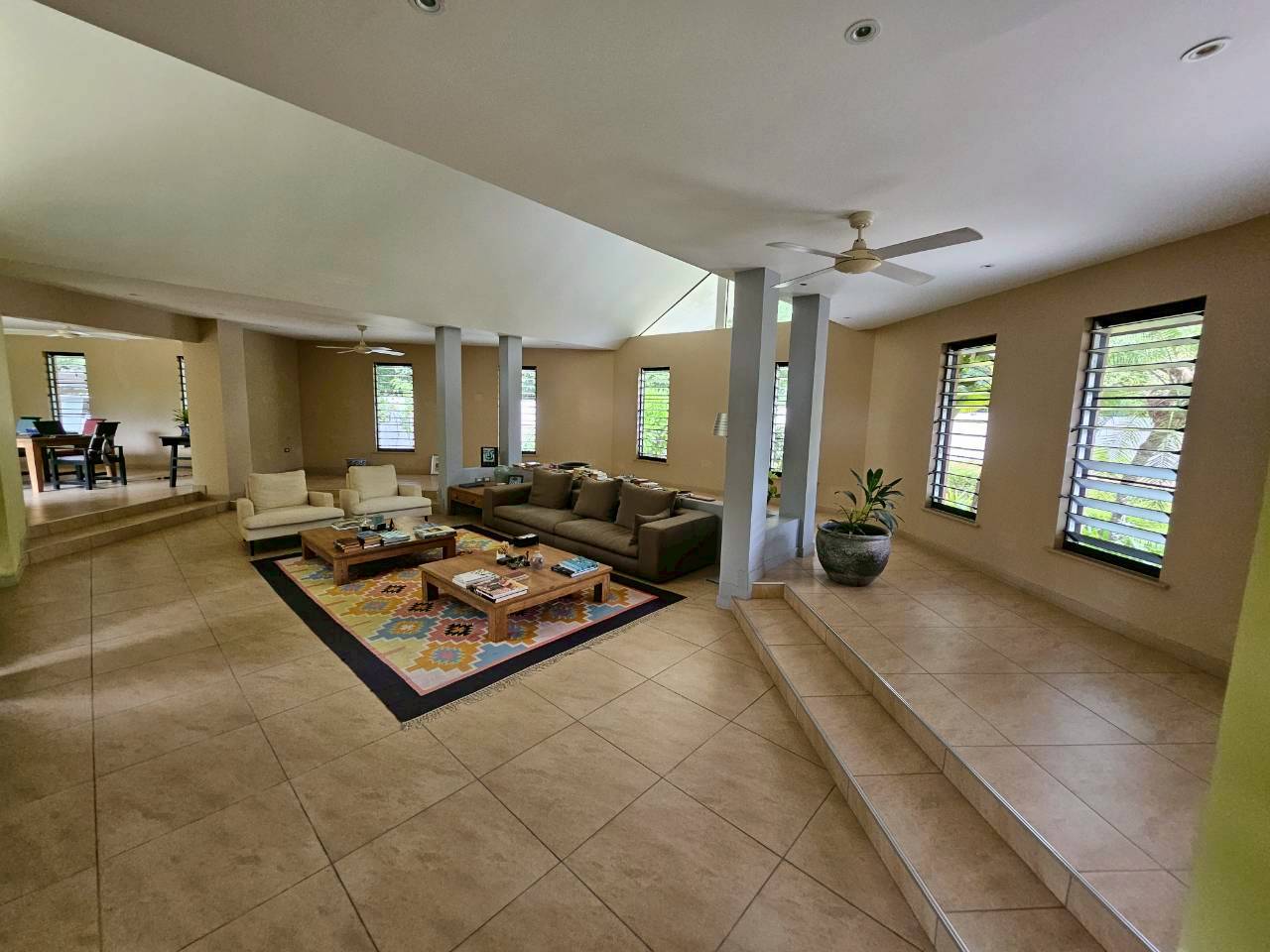 Spacious living room with garden views