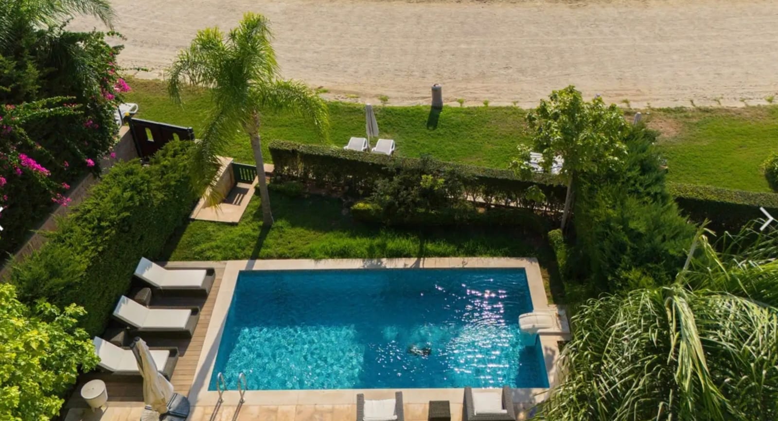 Outdoor Features: The villa’s outdoor space is equally captivating, offering a serene oasis against the backdrop of the Mediterranean. A beautifully landscaped garden surrounds the private swimming pool, inviting residents to enjoy the sun and unobstructed coastline views. The veranda includes an outdoor dining area, extending the villa’s luxurious lifestyle. Beyond the garden, the villa enjoys exclusive access to the private beach through a secure gate, reserved solely for Limassol Marina residents. A beach cafe next door adds convenience for dining or refreshments by the sea.